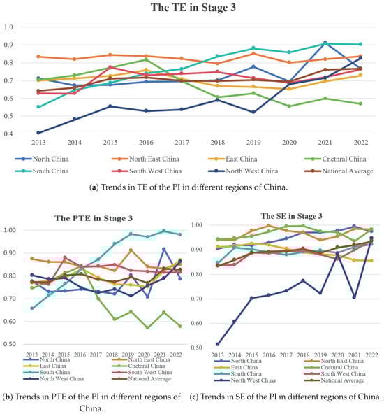 As shown in Table 3, of the 31 provincial-level regions in China, Tianjin, Liaoning, and Tibet exhibit the highest levels of both TE and PTE, while Ningxia, Gansu, and Xinjiang have the lowest levels of TE and PTE. In this stage, the regional disparities in China’s PI are illustrated in Figure 5, and the regional distribution of overall TE in China can be found in Figure 6a.