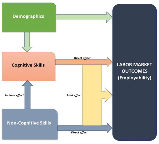 According to the study’s framework (Figure 1), labor market outcomes are directly influenced by demographics, cognitive skills, and non-cognitive skills. Furthermore, non-cognitive skills indirectly impact labor market outcomes by enhancing cognitive skills.
