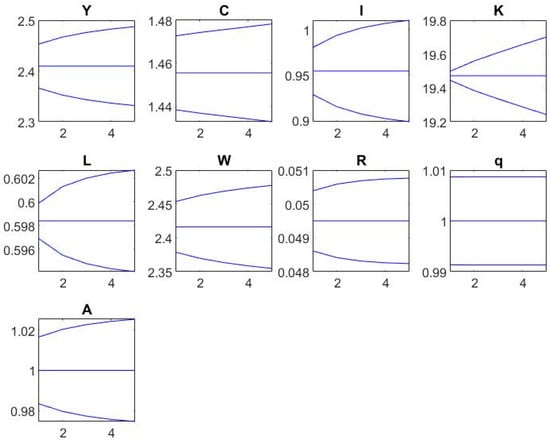 - Equation (7): Capital accumulation law. In this model, capital accumulation depends not only on depreciation rate () and investment (), but also on investment adjustment costs () and their intensity ().