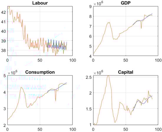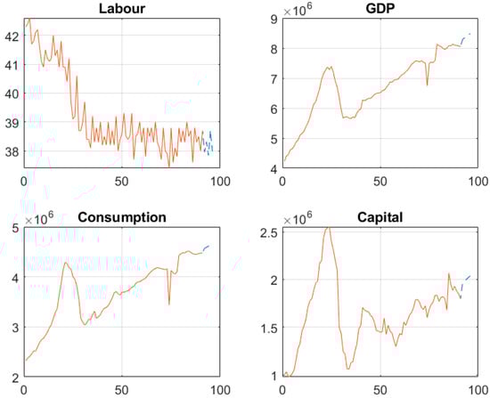 Regarding the obtained forecasts, the calibrated DSGE model forecasts can be interpreted as a kind of ‘story telling’ of the Latvian economy in the long run. These forecasts represented the forecasts of the steady state of the endogenous variables of the model and, in general, did not have a high variability over it. This can also be interpreted as a ‘kind of macroeconomic stability’. The SSA-based forecasts were performed on the statistical data of the real GDP, consumption, capital, and labour and showed high accuracy based on the calculated mean percentage error and absolute percentage error.
