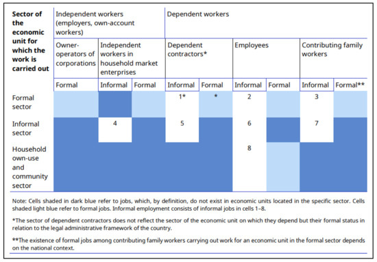 - Gunther, I., & Launov, A. (2012). Informal employment in developing countries: Opportunity or last resort? Journal of Development Economics, 97(1), 88–98. [Google Scholar] [CrossRef]