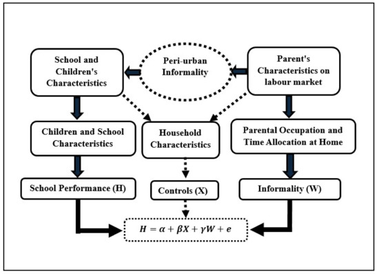 Parental income and education, which are intrinsically linked with the nature of employment, influence children’s educational attainment and cognitive ability and development. Glick and Sahn (2009) found that the cognitive ability among 14–17 year-olds in Senegal was strongly determined by their years of schooling, while parental education and household wealth played a nominal role. The paper also found that familial background significantly affected the years of schooling, and thus the cognitive ability of the children was shaped, indirectly and in a modest way, by the education and income of the parents. Rungo et al. (2015) also showed how family socioeconomic status and education are robust determinants of a child’s educational attainment, but the paper did not establish the relationship between informality and a child’s academic performance. Paxson and Schady (2007), similarly, found strong associations between household wealth and parental education with higher school scores, but they too did not consider the connection between informality and a child’s performance.