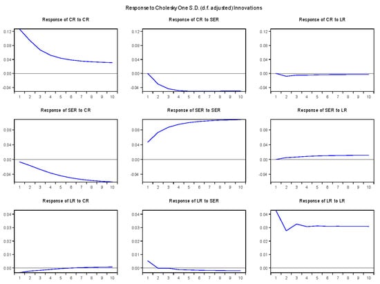 The exploration of dynamics among solvency, credit risk, and liquidity risk utilized a sophisticated Vector Error Correction Model (VECM) in this analysis. Spanning an extensive dataset across 12 years, encompassing 21 banks from 2011 to 2023, the VECM framework was constructed with three endogenous variables and three exogenous variables. Its lag order of 2, determined by the Schwarz Information Criterion (SIC), enabled a comprehensive understanding of temporal relationships. To unravel the complex interplay among these financial factors, the analysis ventured beyond mere estimation. Orthogonalized Impulse Response Functions (IRFs) and variance decomposition were meticulously computed post-VECM estimation (Figure 2). These tools were instrumental in discerning the nuanced impact of each variable over the temporal horizon, shedding light on short-term dynamics and long-term equilibrium relationships.