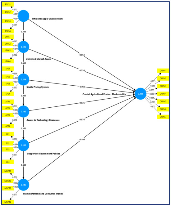 The path coefficients presented in Table 6, indicate varying significance levels and influence among the variables. Notably, “Access to Technology Resources” has an insignificant effect on “Coastal Agricultural Product Marketability” with a low T-statistic and high p-value. At the same time, it strongly influences “Supportive Government Policies” significantly (T = 5.565, p < 0.001). “Efficient Supply Chain System” similarly shows no significant effect on marketability but strongly impacts “Unlimited Market Access” (T = 4.963, p < 0.001). “Market Demand and Consumer Trends” positively and significantly affects marketability (T = 2.033, p = 0.042). “Stable Pricing System” significantly influences “Access to Technology Resources” (T = 6.730, p < 0.001). “Supportive Government Policies” strongly affect “Market Demand and Consumer Trends” (T = 4.373, p < 0.001). Finally, “Unlimited Market Access” significantly influences both marketability (T = 2.109, p = 0.035) and “Stable Pricing System” (T = 5.090, p < 0.001), indicating key roles in driving outcomes. Overall, paths with p-values less than 0.05 demonstrate statistically significant relationships. Findings by Kumi et al. (2023) suggest that policies and interventions aiming to improve market access, promote e-commerce, and consider farmers’ preferences and market power dynamics can significantly impact farmers’ incomes, poverty levels, and overall rural economic development.