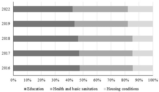 At first, the multidimensional poverty index was obtained by gathering indicators related to education, health, basic sanitation, and housing conditions, as outlined in Table 3. In 2016, the adult population in households experiencing multidimensional poverty had the highest level of deprivation in terms of years of study, that is, the absence of at least one adult with complete primary education in the household, which was equal to 91.6%. In terms of education, the second most severe deprivation for young individuals is the delay in completing secondary education, which stands at 62.2%. This is followed by school attendance in basic education, with deprivation of 21.2%, which considers both primary and secondary education. In 2022, high levels of educational deprivation persisted among those in multidimensional poverty, reaching 15.6% in school attendance, 54.9% in academic delay among young people, and 86% in years of study in the adult population.