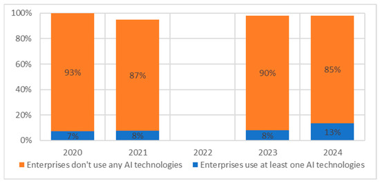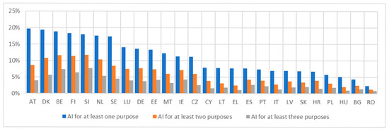 As Figure 1 shows at the EU level, enterprises had a very small rate of AI adoption, but comparing the values of 2024 with 2020, the AI adoption rate almost doubled, increasing from 7% to 13%.