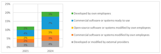 The analysis of the AI technologies’ source used by GE10 enterprises at the EU level revealed that 84% of the enterprises that adopted AI technologies used open source, commercial or externally developed software, compared with 16% that used their own created software. This shows that enterprises preferred to use externally created AI software instead of creating their own software (Figure 2).