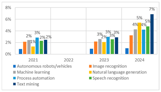 The enterprises’ interest in adopting different types of AI technologies is strongly connected to the specifics of each one. By analyzing the types of AI technologies adopted by enterprises, some aspects became relevant. In 2021, 3% of enterprises preferred process automation (PA), 2% machine learning (ML) and 2% text mining (TM), but these preferences were changed by the performances achieved by the AI technologies related to natural language generation (NLG) in 2022, proved by the launch of ChatGPT. After a slow change of AI adoption rate in 2023, these advances stimulate the increase in adoption of TM to 7%, NLG and speech recognition (SR) both to 5% and ML to 4% in 2024 (Figure 3).
