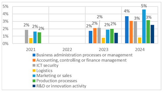 First, in 2021, the enterprises used AI technologies only for four purposes (ICT security, marketing or sales and production process) and in a very small percent (under 2%). Over time, the diversity of purposes increased rapidly, reaching seven in 2024. The enterprises became interested by other purposes like business administration processes or management, accounting, controlling or finance management and R&D or innovation activity. In 2021, ICT security was the dominant purpose (2%); this changed over time, and in 2024, the dominant purposes were marketing or sales (5%) and business administration processes or management (4%). There is only one purpose where the interest of enterprises remained low (under 1%) and constant over time: logistics.