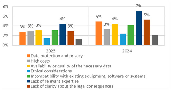 Weak regulation and data privacy issues slowed the adoption of AI technologies. If for a long time the barriers related to technical and regulatory capacities were the main problems encountered in the implementation process, by 2024, especially in the case of SMEs, a new main factor represented by cost has emerged.