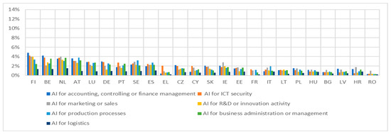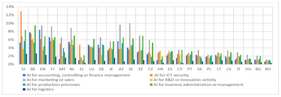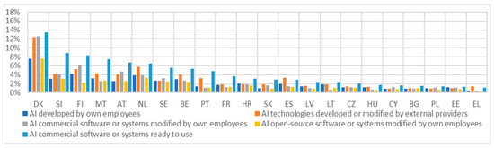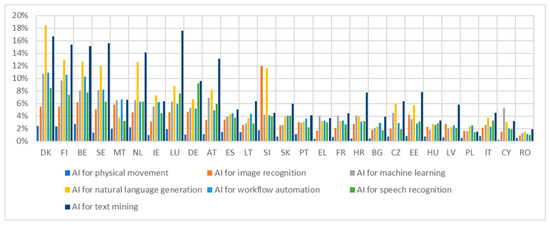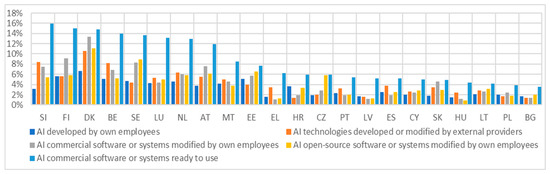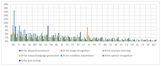 The analysis of patterns in the adoption of AI technologies highlighted divergent approaches across EU countries. Some EU countries preferred to specialize in using AI for IR, for example, while others preferred to use AI for TM or WA. This divergence suggests that a one-size-fits-all policy on AI might not be effective for all EU countries. Differences were also recorded between enterprises from different countries in terms of assessing the bias of AI technologies, with a clear preference for checking the externally developed AI solutions.