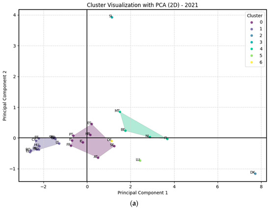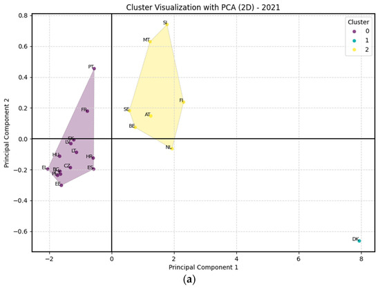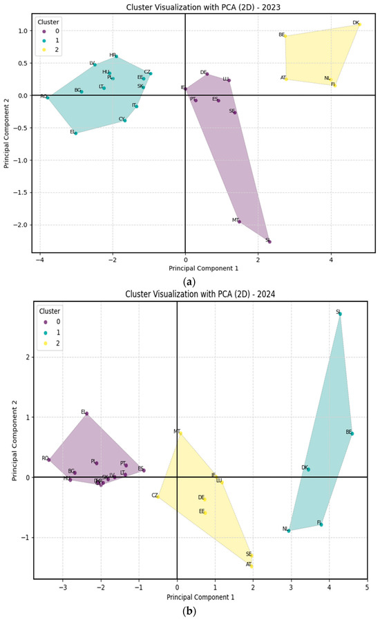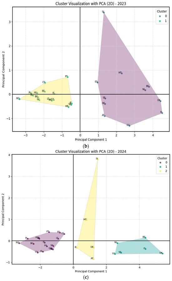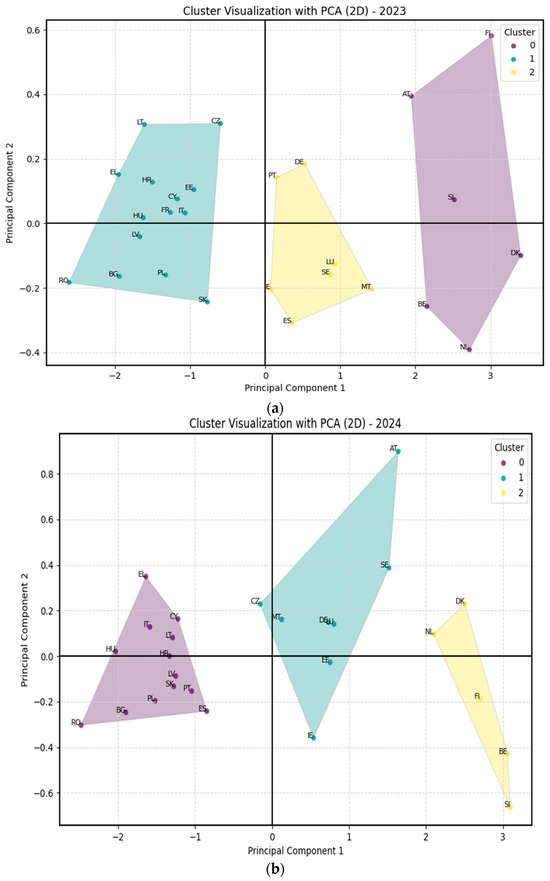 In order to characterize the AI adoption process within EU countries, we studied this topic using a top-down approach, first at the EU level and second at the level of the individual EU countries. This approach allowed us to identify both the commonalities and the differences in AI adoption across EU countries. A preliminary data analysis highlighted that because there are many similarities between countries situated in different regions of the EU due to their cultural, economic and historical backgrounds, groups of countries with similar characteristics regarding the AI adoption process are formed. A cluster analysis is required in this case. We ran an initial cluster analysis for finding the characteristics of clusters to determine which type of clustering analysis is adequate, in a robust manner, using principal component analysis (PCA) visualization and the following four metrics: