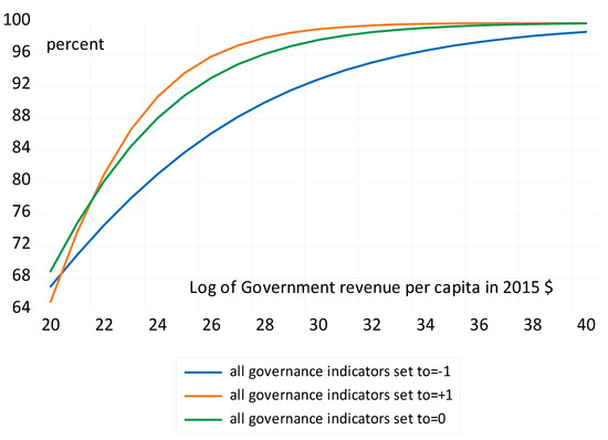 The estimates presented above seem reasonably satisfactory, but it is difficult to obtain a clear understanding of exactly what is going on purely from these estimates. This is partly because we have many countries and every country will be different, and space constraints make it impossible to show the behaviour of each country individually. Therefore, to help understand both the importance of governance effects and that of the GRpc, we conducted a simple set of experiments. We begin by setting all governance indicators to −1, which is generally a poor level of governance. We then calculated the long-run relationship between revenue and the provision of electricity and clean fuels. We then reset all governance indicators to zero, the midpoint of the range, and calculated the relationship between the GRpc and the two indicators. We then applied a further experiment in which we set all governance indicators to +1. We do not go all the way to setting the governance indicators at +2.5, as we recognise that this is a highly unrealistic goal. We then graph each set of relationships to observe the effect of an improvement in both governance and revenue. Figure 3 and Figure 4 show the graphs for this experiment for two measures: the log of the GRpc between 20 and 40 in 2015 prices.