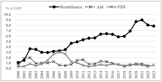 32. Jongwanich, J., & Kohpaiboon, A. (2019). Workers’ remittances, capital inflows, and economic growth in developing Asia and the Pacific. Asian Economic Journal, 33(1), 39–65. [Google Scholar] [CrossRef]