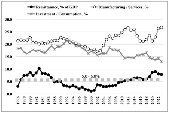The policy implication from the above empirical results is that overdependence on emigrants’ remittances has a detrimental effect on economic performance from sectoral and intertemporal perspectives. Economic growth is attainable even without a high dependence on remittance inflows. Figure 2 and Figure 3 show that during the 2000s (the era under President Musharraf) in Pakistan, there were high economic and manufacturing and investment growths despite a lower remittance–GDP ratio (under the 5% threshold).