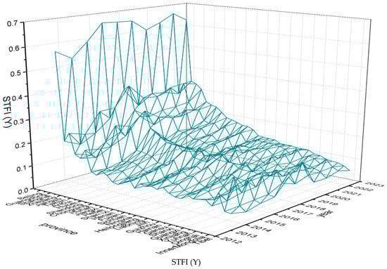 Figure 4 presents a surface plot of the comprehensive science, technology, and finance (STF) index and its secondary indices for various provinces and municipalities in China from 2013 to 2022. The results indicate significant variations in the comprehensive STF index among provinces, yet an overall upward trend is observed over the study period. As China’s financial hubs, Beijing, Guangdong, and Shanghai exhibit considerably higher levels of STF development compared to other regions. In 2013, there were 14 provinces with an STF index exceeding 0.1, including Qinghai, Shaanxi, Liaoning, Chongqing, Shandong, Anhui, Tianjin, Jiangsu, Zhejiang, Shanghai, Guangdong, and Beijing. By 2022, the number of provinces surpassing this threshold had surged to 26, marking an 85.71% increase. The highest value also rose from 0.579 in Beijing in 2013 to 0.635 in the same city in 2022. Six provinces—Hubei, Jiangxi, Hunan, Anhui, Hebei, and Henan—witnessed an index growth exceeding 100%, with growth rates of 151%, 150%, 147%, 145%, 109%, and 102%, respectively.