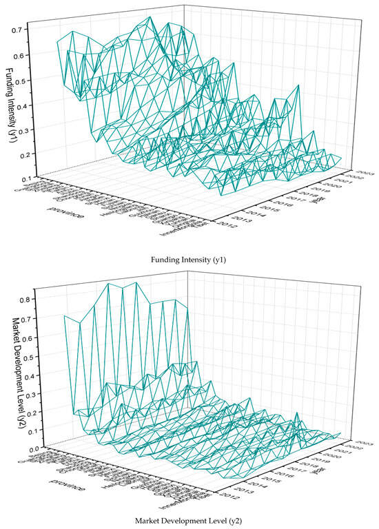 - Investment Intensity (y1) is the foundation of technology finance development. Adequate funding supports technological innovation, promoting the research, development, and application of new technologies and products. The specific indicator design incorporates funding situations from multiple levels, including government, enterprises, financial institutions, and society, to reflect the funding supply conditions and liquidity of technology finance activities within a region.