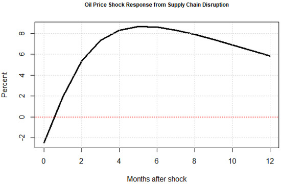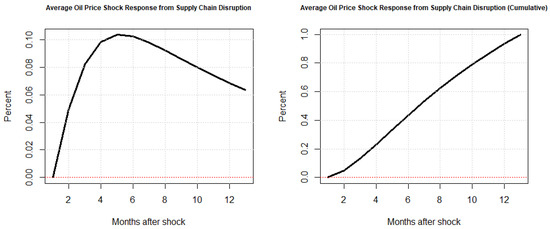 where is our vector of endogenous variables, is a drift term, and is a linear time trend. From Equation (1), we can simulate the response of a supply chain pressure to an oil price shock for months ahead. Figure 1 shows the results of this simulation.
