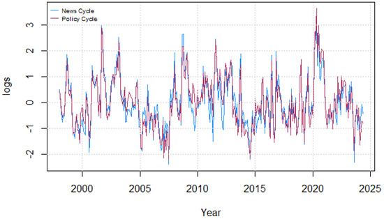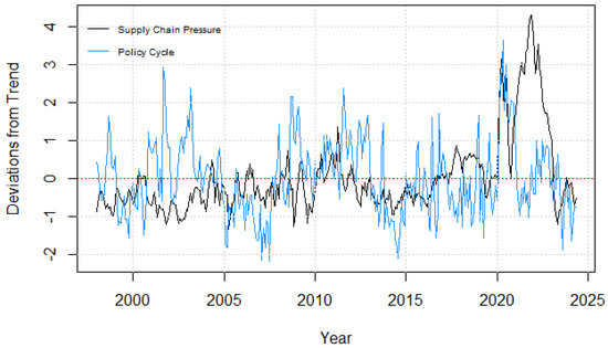 All data are from the United States and span from January 1998 through May 2024, making for a sample size of . The level of political uncertainty in the United States is pulled from the Economic Policy Uncertainty database, while crude oil prices are reported at daily frequencies, and subsequently averaged to monthly frequencies by the U.S. Energy Administration.1 Finally, data on global supply chain pressures are available from the New York Fed. With our policy uncertainty cycle derived in Section 3.1, , we convert the crude oil price level to a rate of inflation by taking the log of the ratio of crude oil prices at time t relative to months ago, such that . While unreported, we utilize augmented Dickey–Fuller tests to ensure and subsequently confirm that our data are stationary and suitable for further econometric analysis. Table 1 reports descriptive statistics and correlation coefficients associated with our principle data series.