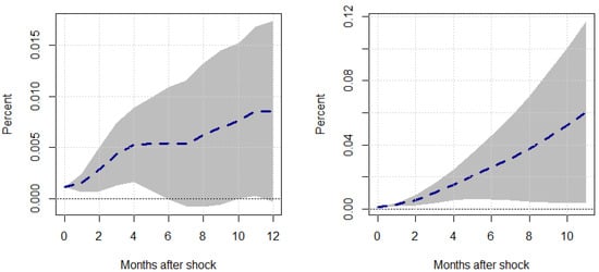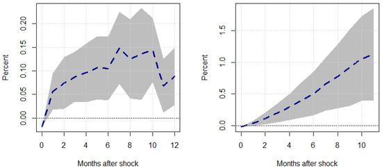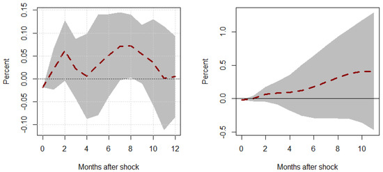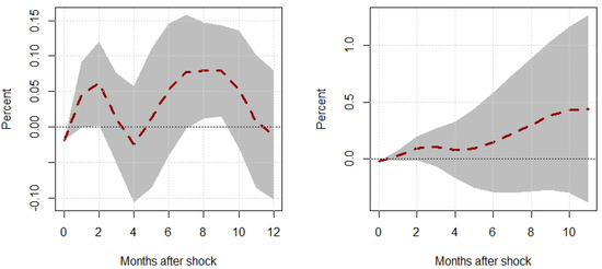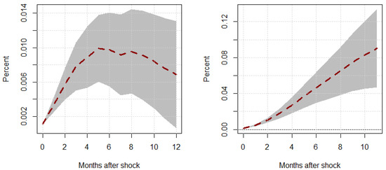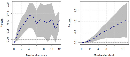 where the parameters , , and are smooth functions of t, time. When constructing impulse–response functions, we will have values of each response variable projected over h forecast periods; therefore, each impulse response function for a single variable’s response to a single shock will have observations. To present our impulse–response functions graphically, we take the average of all smooth estimates across each forecast period. This produces an average response that supplements our initial results. Specifically, we are interested in the response of to a shock. Figure 12 illustrates this response.
