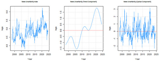 News uncertainty index decomposition. This figure shows our news uncertainty index, (left panel), the demeaned trend component, (middle), and our demeaned cyclical component, (right panel).