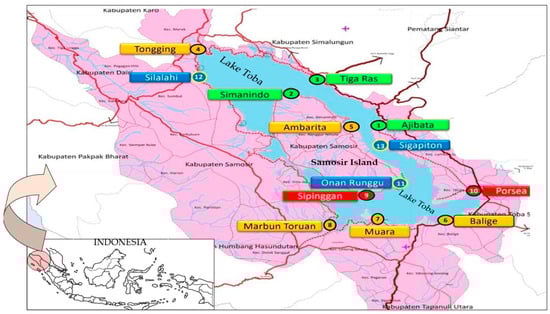 Lake Toba, situated in North Sumatra Province, is the largest lake in Indonesia, encompassing a water surface area of 1130 km2 and reaching a depth of 1667 feet. As illustrated in Figure 1, Lake Toba is divided among eight regencies and is currently recognized as part of Indonesia’s Super-priority National Tourism initiative. Samosir Island, one of the regencies within North Sumatra Province, is located over 212 km from the provincial capital. Although Samosir Island is part of Sumatra Island, it is separated from the mainland, as it lies in the center of Lake Toba. With an area of 2069.05 km2 and a population of 148,123 residents, Samosir Island has emerged as a significant tourist attraction. The only connection between Samosir Island and the Sumatra mainland is a single bridge; therefore, ferry transportation plays a vital role in the movement of people, goods, and vehicles.