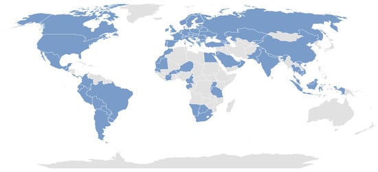 In this study, data were gathered from several sources for 87 countries around the world for the period of 2010 to 2021, which are shown in Figure 1 (detailed information about the names of countries is provided in Appendix A). Only 87 of 156 countries were included due to data completeness.