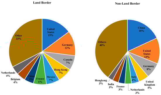 Figure 2 presents the distribution of international trade performance of countries to trading partners with and without land borders. In the category of trade to countries with land borders, the United States recorded the highest contribution of 15%, followed by Germany (12%), Canada (7%), Hong Kong (7%), and Mexico (7%). No single country had a proportion of trade to countries with land borders exceeding 20%, reflecting a relatively even trade distribution pattern between countries. This shows that most countries around the world continue to maintain trade relations with trading partners that have geographical proximity through land borders. In terms of trade to non-land-border countries, China is the country with the largest share, at 18%. The United States and Germany again recorded significant contributions of 13% and 8%, respectively. Furthermore, the United Kingdom, Italy, the Netherlands and France each contributed 5%, 4%, 3%, and 3%, respectively. As with trade to land-border areas, 40% of trade to non-land-border countries is spread across various other countries. This finding confirms that global trade activity shows a wide and balanced level of distribution, both in trade to land-bordering and non-land-bordering countries, which confirms the importance of the geographical dimension in the structure and strategy of international trade.