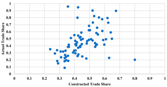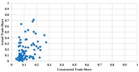 Figure 3 and Figure 4 also reveal the correlation between constructed and actual trade in the case of land-border and non-land-border countries. The distribution patterns observed in the scatterplots show clear differences in the relationship between constructed trade shares and actual trade, depending on the type of international border. For countries sharing a land border, the data points showed concentrated clustering, indicating a relatively uniform alignment between natural trade potential and realized outcomes. In contrast, the data for countries without a land border showed a more dispersed pattern, indicating heterogeneity in realized trade relative to expected potential. These findings imply that border characteristics significantly influence the extent to which a country’s trade potential, as estimated by the gravity-based constructed trade share, translates into actual trade performance.