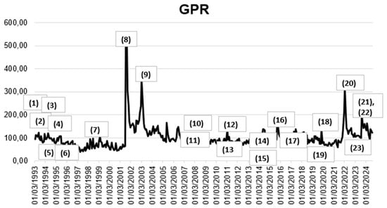 Notable spikes in the index are observed during significant historical events, such as the aftermath of 9/11, the US–Iraq war, the Russia–Ukraine war, and the banking instability of Silicon Valley Bank (see Figure 1). Elevated geopolitical risk is linked to declines in investment (S. Wang et al., 2019), stock market performance (Agoraki et al., 2022), and employment levels (Ji et al., 2025). Others established a link with energy transition and environmental sustainability (Q. Wang et al., 2024; Cutcu et al., 2025). The GPR also correlates with an increased likelihood of economic crises and heightened downside risks for the global economy. Importantly, the GPR is associated with high inflation and uncertainty levels (Caldara et al., 2024).