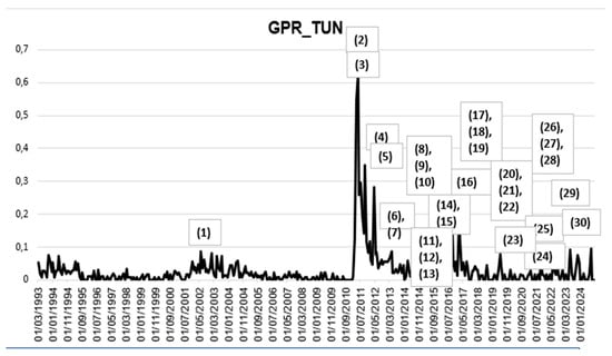 The evolution of the local geopolitical risk (GPR_TUN). (1) 04/2002: A terrorist bombing at the Ghriba synagogue in Djerba kills 21 people, including foreign tourists. (2) 01/2011: The Arab Spring begins in Tunisia. (3) 10/2011: Tunisia holds its first free elections. The Islamist Ennahdha party wins a majority in the Constituent Assembly. (4) 04/2012: Heightened political debate and economic instability in Tunisia. (5) 02/2013: Opposition leader Chokri Belaid is assassinated, leading to political turmoil. (6) 07/2013: Opposition leader Mohamed Brahmi is assassinated, triggering mass protests. (7) 10/2013: Political crisis due to (5) and (6). (8) 01/2014: Tunisia adopts a new democratic constitution. (9) 10/2014: Parliamentary elections are held, with Nidaa Tounes emerging as the largest party. (10) 12/2014: Beji Caid Essebsi is elected as Tunisia’s first democratically chosen president. (11) 03/2015: The Bardo Museum attack in Tunis kills 22 people, mostly foreign tourists. (12) 06/2015: A terrorist attack in Sousse targets tourists, killing 38 people. (13) 11/2015: A suicide bombing on a presidential guard bus in Tunis kills 12 people. (14) 03/2016: Terrorist attack in Ben Guerdane. (15) 09/2016: Internal political tensions. (16) 02/2017: Transiotional justice mechanisms, (17) 05/2018: Tunisia holds its first municipal elections under the new constitution. (18) 01/2018: Protests erupt against austerity measures tied to IMF reforms. (19) 09/2018: Socio-economic pressures. (20) 04/2019: Slight economic improvements despite fiscal challenges. (21) 07/2019: President Beji Caid Essebsi dies, triggering early presidential elections. (22) 10/2019: Kais Saied, an independent candidate, wins the presidential runoff election. (23) 03/2020: Tunisia implements strict lockdowns to combat COVID-19, highlighting economic vulnerabilities. (24) 07/2021: President Kais Saied suspends parliament, dismisses the prime minister, and assumes executive authority, citing a national emergency. Critics call this a coup. (25) 09/2021: Saied issues a decree consolidating his control over legislative and executive powers. (26) 02/2022: Saied dissolves the Supreme Judicial Council, further centralizing power. (27) 07/2022: A new constitution is approved in a controversial referendum, significantly expanding presidential powers. (28) 12/2022: Parliamentary elections are held with low voter turnout, indicating public discontent. (29) 03/2023: Protests erupt over worsening economic conditions, including inflation and unemployment. (30) 11/2023: Debates on governance reforms and managing public debt. Sources: Washington Watch, US Institute of Peace, Human Rights Watch, Carnegie Endowment.