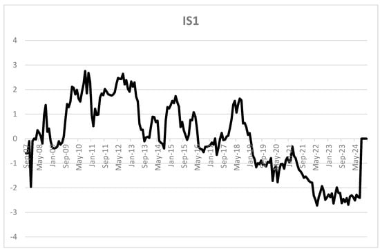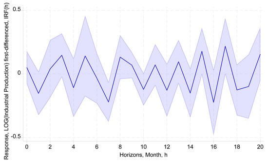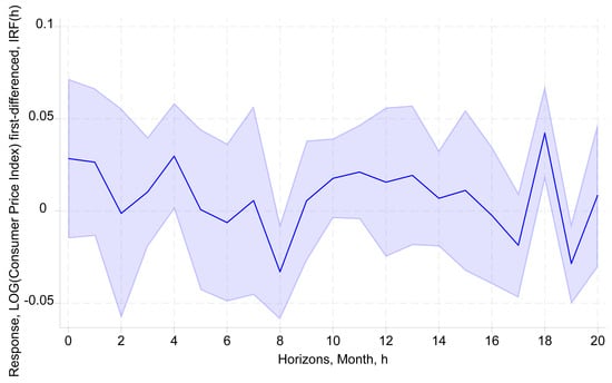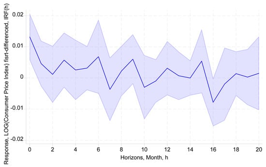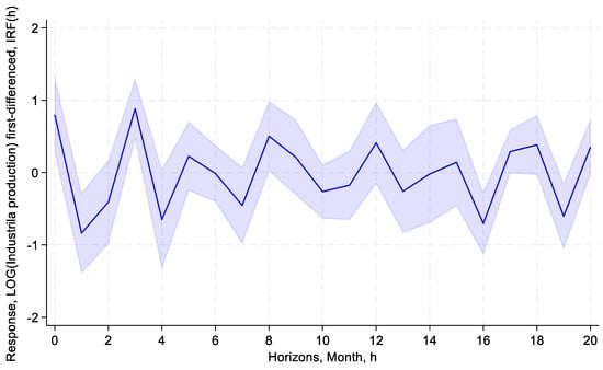 where denotes the size of the shock, with , pertaining to a one standard deviation in a variable. The subscript indicates the causal link between the intervention and the result. The specific value is not particularly relevant if a linear model is used. However, if a non-linear relationship is proposed, it may influence the shock variable. From Equation (5), we can easily deduce that . We assume that is exogenous, leading to . Equation (4) is then estimated using Ordinary Least Squares (OLS) for each subsequent horizon , which relates to a semi-parametric estimation of . Although may exhibit serial correlation up to certain lags, this does not impact the consistency of . In contrast to Vector Autoregressive (VAR) models, Equation (4) is a single equation rather than a system of equations.