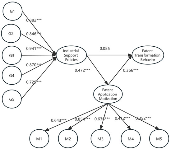 Among policy instruments, public service policies have the greatest impact on patent application motivation. Specifically, the coefficient of G3 (policy for constructing industry–university–research collaboration platforms) is 0.941, indicating that policies promoting such platforms significantly enhance patent application motivation. Industry–university–research collaboration improves enterprises’ high-quality innovation capabilities by facilitating the sharing of information, knowledge, and technology among collaborators. The path coefficients of G1 (policy for cultivating and introducing professional talent) and G4 (policy for promoting shared access to equipment and testing facilities) are 0.882 and 0.870, respectively, reflecting the strong influence of human capital and capital investment policies on patent application motivation. These coefficients are higher than those of G2 (tax reduction and fee exemption policies conditional on patent industrialization, 0.846) and G5 (intellectual property pledge financing, venture capital, etc., 0.729), suggesting that special policies targeting human capital and fixed asset investment are more effective in stimulating patent application motivation, while financial subsidies, such as tax relief, have weaker effects. The results of the structural equation modeling (SEM) path analysis of mediating effects are shown in Table 9.The path analysis diagram of the mediating effect in the structural equation model is shown in Figure 1.