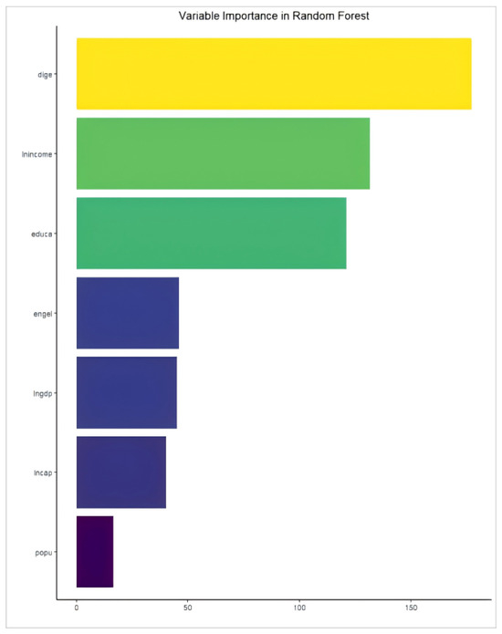 Random forest regression was applied to assess the relative impact of digital economy development and contextual variables on Chinese-style modernization over the 2011–2021 period. As visualized in Figure 1, the variable importance was quantified using the residual sum of squares (RSS) metric, which measures predictive improvement through tree-based recursive partitioning. Strikingly, the digital economy emerged as the most influential determinant of modernization outcomes, underscoring its pivotal role in advancing sustainable development trajectories. Complementary factors like market efficiency and technological capacity also exhibited significant explanatory power, highlighting the importance of institutional and innovation ecosystems in mediating digital transformation effects. These results reinforce the urgency of policy action to optimize digital infrastructure investments and foster innovation ecosystems, aligning with SDG 9 (industry, innovation, and infrastructure) and SDG 13 (climate action) to achieve inclusive and resilient modernization.