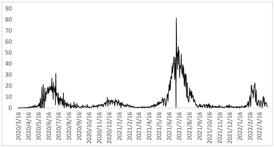 New confirmed COVID-19 cases per million in Benin. Source: Authors, using Johns Hopkins University CSSE COVID-19 data, 2022.