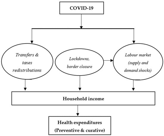 The population affected by the COVID-19 outbreak can be classified into two groups, namely the infected and the susceptible, with the possibility of having both groups of people within the same household. On the one hand, those infected are drawn out of the labour market, increasing unemployment by reducing the labour supply and leading to a decrease in household income. The government intervenes to temper the decrease in income by cash transfers and tax redistribution. The treatment expenses increase directly with health expenditure (curative and preventive). However, since household income decreases, health expenditures may decrease as a consequence. On the other hand, the susceptible population takes prevention measures that increase health expenses while simultaneously experiencing income losses. Moreover, to prevent contamination, the government takes barrier measures (e.g., lockdowns, internal and external border closures, and bans on public gatherings) that slow down economic activities and cause a recession that affects the labour markets through unemployment due to the decrease in labour demand. These governmental measures lead to a decrease in income and ultimately to a decrease in health expenditures at the household level. The channels through which COVID-19 affects income and health expenditures are instrumental to the evaluation of the effects of the pandemic.