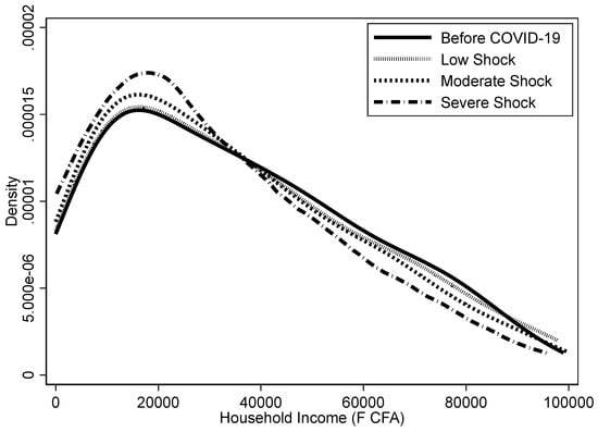 More importantly, the distributional analysis of the effect of COVID-19 on income revealed that there was a heterogeneous shrinkage in household income. As depicted in Figure 4, low- and middle-income households were the most vulnerable to COVID-19. Indeed, it can be seen that the gap between the before-COVID-19 curve and that of the after-COVID-19 decreases from lower-income to higher-income. Our results confirmed those of () in Rwanda. These authors concluded from microsimulation modelling that COVID-19 had a heterogeneous effect on household income. Notably, middle- and high-income quintile households experienced the highest decline in income (35%), whereas income declined by 28% on average in low-income quintile households. () also studied the effect of COVID-19 on poverty in Nigeria and found that the first two quintiles of income groups recorded a decline in their income by 15% on average, while the third, fourth, and fifth income quintiles experienced an income shrinkage of 24% on average during six weeks of lockdown in Nigeria. Furthermore, they concluded that urban household residents were the most affected by the COVID-19 pandemic, which lowered their income by 27% on average, whereas rural residents lost an average of 18%.