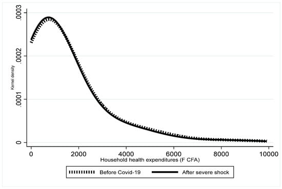 We now simulate the effects of COVID-19 on health expenditure. The results presented in Figure 5 indicate that households experienced an increase in health expenditures after the COVID-19 shock, with heterogeneous effects. Indeed, a decrease in household income, ceteris paribus, will lead to a decrease in household health expenditures. Before COVID-19, the pre-COVID-19 shock curve, as shown in Figure 5, was above the post-COVID-19 one. In addition, the results show that the effect of COVID-19 on health expenditures is heterogeneous, meaning that households with low health expenditures were the most affected by the COVID-19 pandemic. The gap between the before-COVID-19 curve and the after-COVID-19 curves decreases from low health expenditures to high health expenditures.
