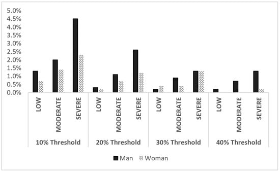 The results from Equation (11) indicated probabilities of job loss of 0.55 and 0.30, respectively, for men and women. Then, we calculated the risk of job loss conditional to gender and residence using a multiplier as follows: