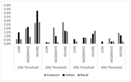 In addition to vulnerability based on economic status, our results reveal that the severity of the impact of COVID-19 varies according to the age, educational level, and gender of the household head, as well as the place of residence. Table 6 indicates that households headed by younger individuals are the most affected, followed by those headed by adults. Secondly, gender-based analysis shows that male-headed households experience the greatest income losses, regardless of the scenario considered. For instance, under a moderate COVID-19 shock, income fell by 14.74% for male-headed households, compared to an 8.23% decline for those headed by females. Thirdly, households headed by individuals with higher education are the most affected, followed by those with secondary education. Finally, the place of residence also matters: households residing in the capital city, Cotonou, are the most affected, followed by those in other urban areas. Under a moderate COVID-19 shock scenario, households in Cotonou and other urban areas would experience income declines of 15.6% and 11.8%, respectively, compared to 9.7% among rural households.
