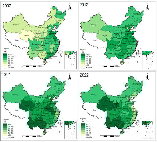 Table 3 displays the average values and rankings over 2007–2022. It can be observed that the average economic rebound effect in China reached 77.14%, indicating a significant partial rebound effect. This implies that the expected energy savings from improved energy efficiency were partially offset by the additional energy consumption, resulting in a discounted realization of the expected energy savings. The top five provinces with the largest rebound effects were Guangxi (92.16%), Henan (88.97%), Sichuan (87.08%), Anhui (86.35%), and Guizhou (85.85%), all of which exceed the national average and are located in the western region except for Henan and Anhui. Conversely, the five provinces and municipalities with the lowest rebound effects are Shanghai (52.89%), Beijing (57.63%), Hainan (61.89%), Tianjin (62.31%), and Inner Mongolia (65.89%), all of which are below the national average and located in the eastern coastal region except for Inner Mongolia.