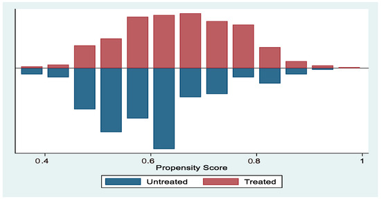 Figure 2 illustrates the distribution of propensity scores among treated and untreated households before matching. The figure highlights noticeable imbalances between the two groups across several score intervals.