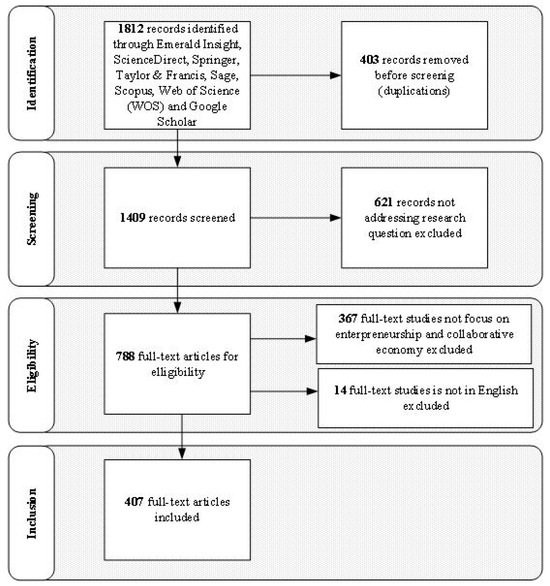 This meticulously crafted search string reflects the breadth of terms associated with the CE, as well as the diversity of economic activities linked to this phenomenon. As a result, the initial phase of our search identified 1812 articles, with 403 duplicates identified and excluded before starting the screening phase. Subsequently, during the screening phase, 621 articles were eliminated as they did not align with our research objectives. This phase involved a comprehensive analysis of titles, abstracts, keywords, and introduction sections. In the eligibility phase, we conducted a more rigorous examination, leading to the removal of 367 articles that did not jointly explore the topics of CE and entrepreneurship, along with 14 articles not written in English. Ultimately, our analysis encompassed 407 articles.