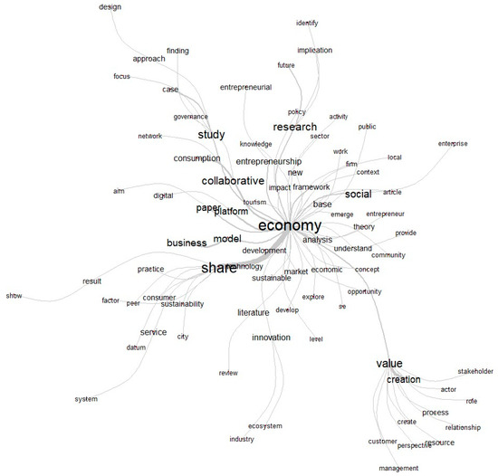 For proper interpretation of this graph, it is essential to consider both font size and line thickness (Bueno et al., 2021). Larger font sizes indicate stronger co-occurrences, while thicker lines represent more intense relationships. Specifically, Figure 2 showcases “economy” as the central active form in our textual corpus, closely linked to the lemmatized form “share” with “value” and “creation” standing out prominently among the rest of the incorporated words.
