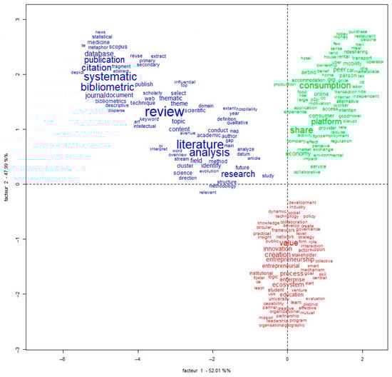 Cluster 2 is the second largest cluster, accounting for 36.1% of the active forms and linked to 38.46% of the analyzed articles. Dominant terms in this cluster include: (1) consumption, (2) share, (3) platform, (4) peer, and (5) economy, leading us to designate it as “sharing economy platforms in entrepreneurial contexts”.