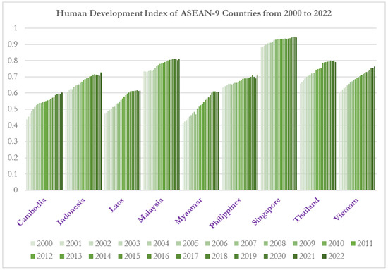 The Human Development Index (HDI) of ASEAN-9 countries (2000–2022). Notes: HDI is a summary metric of human development based on mean and expected years of schooling, logged GNI per capita, and mean of life expectancy. The authors adjusted the data obtained from UNDP database accessed on 19 June 2025 for educational purposes.