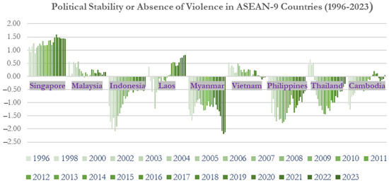 The political stability of the absence of violence in ASEAN-9 countries (1996–2023). Notes: Political stability or the absence of violence can serve as a proxy for the rule of law and government effectiveness in absolute terms and in trends. Absence of violence scores range from −2.5 to 2.5 and reflect the likelihood of political instability or violence including terrorism. The authors adjusted the data obtained from CEIC for educational purposes.