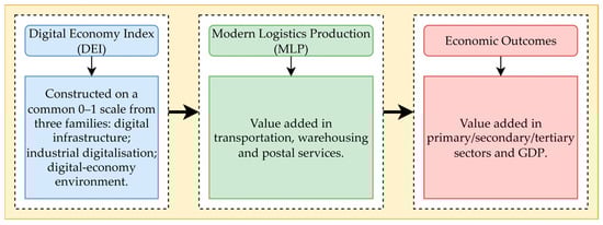 Conceptual framework linking digital economy development (DEI), modern logistics production (MLP), and economic outcomes.