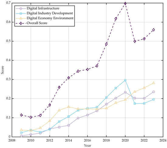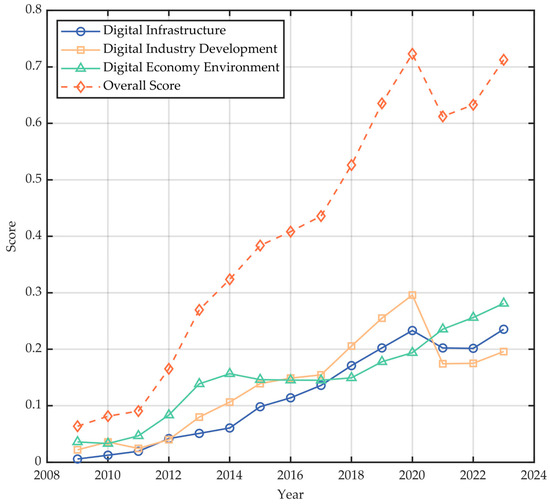 Table 4 reports the annual scores of the three primary dimensions and the composite digital economy index (DEI) for 2009–2023 under the SESP-SPOTIS framework; Figure 3 plots the composite DEI together with the three dimension scores on the common 0–1 scale used throughout.