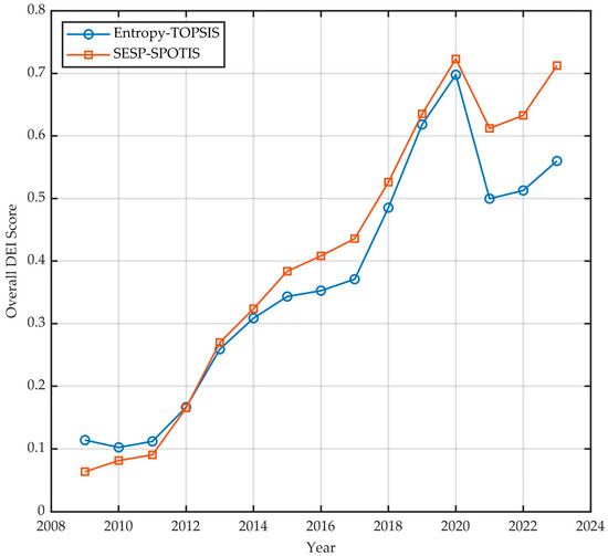 Overlaid annual composite indices: Entropy-weighted TOPSIS vs. SESP-SPOTIS (DEI), 2009–2023.